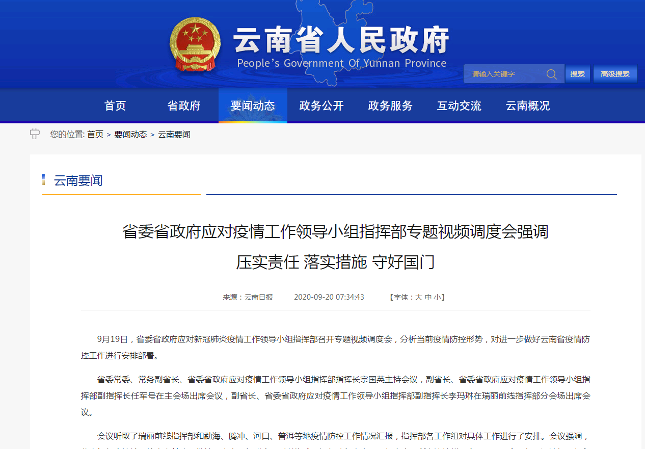 9月19日,省委省政府應對新冠肺炎疫情工作領導小組指揮部召開專題視頻調度會,分析當前疫情防控形勢,對進一步做好云南省疫情防控工作進行安排部署